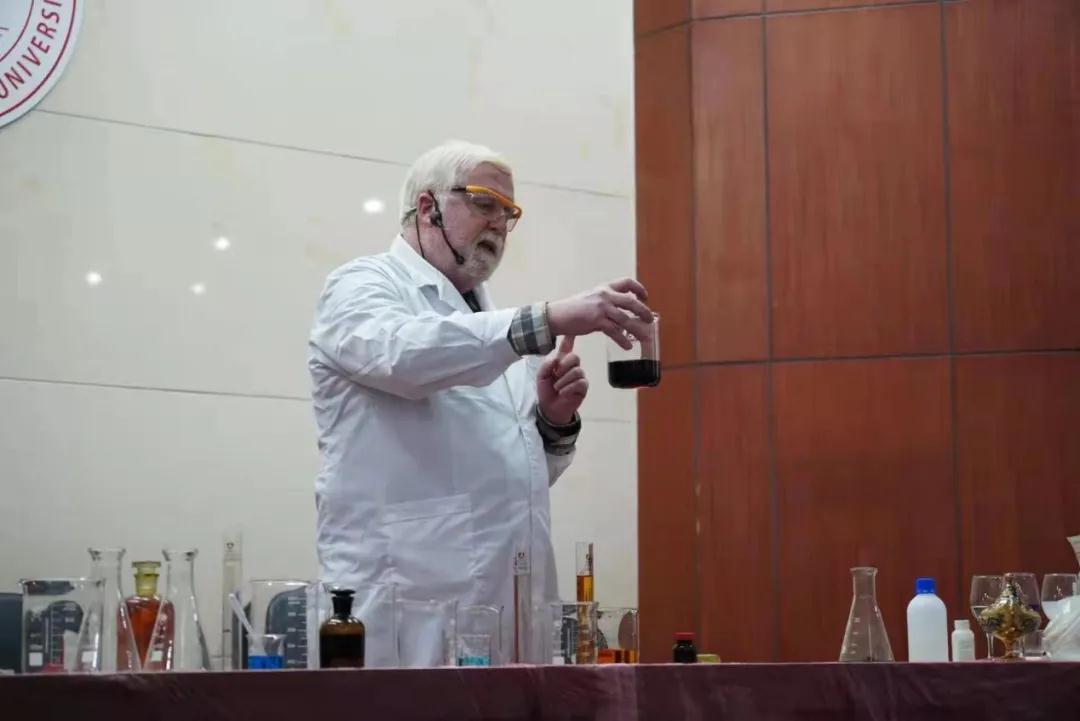 用水点燃蜡烛、神奇的“美年达”、阿拉丁神灯、百转轮回的化学变化……戴伟教授用一个个绚丽精彩的实验,由实验现象到实验原理,重点向大家展示了氧化还原反应、化学反应热力学、催化剂等重要的化学知识,使同学们深切地感受到化学的神奇之美、力量之美、科学之美。同时也指出科学家要具有怀疑精神、实证精神,并向同学们展示化学家设计实验的思路与方法。讲座过程中,戴伟教授用幽默风趣的语言,将化学故事融入日常生活之中,以形式多变、趣味盎然的实验点燃了同学们对化学实验的兴趣,激发了同学们成长为未来科学家的热情。