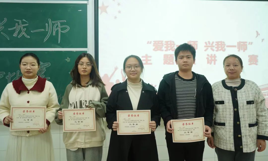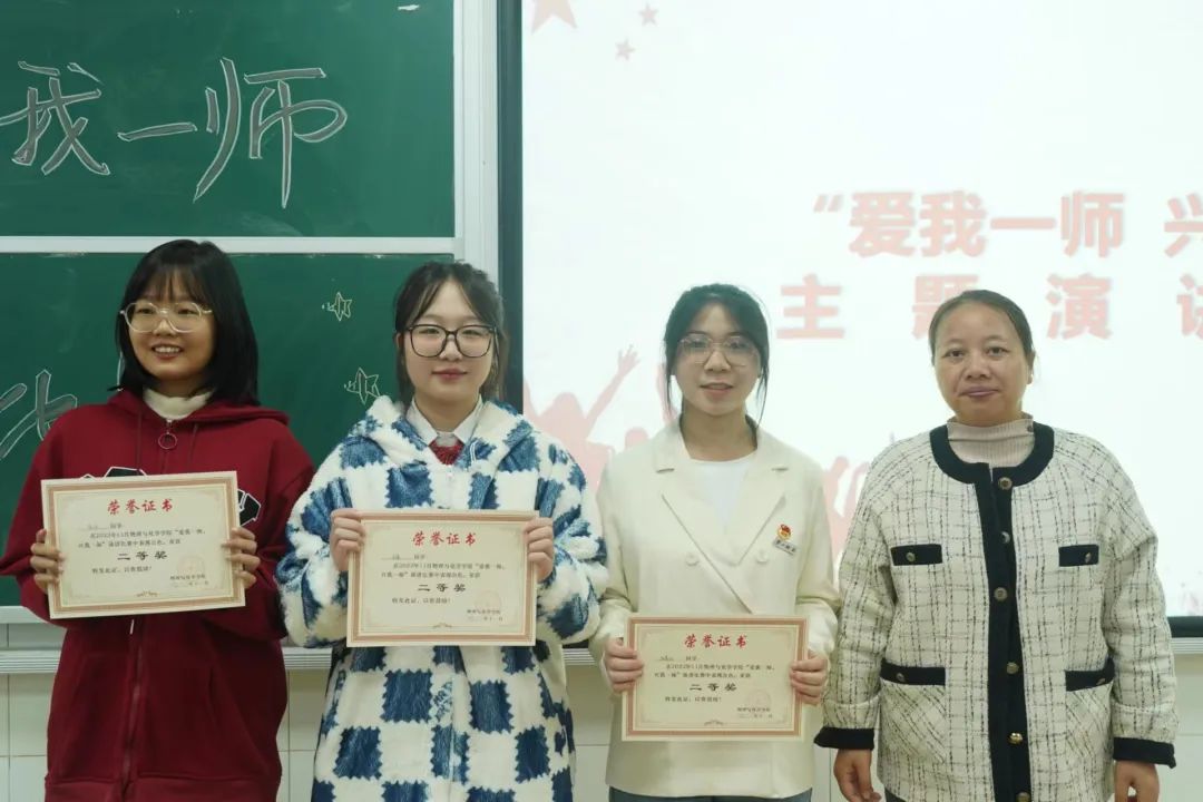 经过各方面综合评审,22级915班罗婷、22级916班王佳怡荣获一等奖,21级878班马缘、21级879班徐洁、21级880班阳嘉丽荣获二等奖,22物理1班傅嘉仪、22科教1班汪雷、21科教1班彭颖、22级917班周泉仪荣获三等奖。最后参赛选手与老师们合影留念。