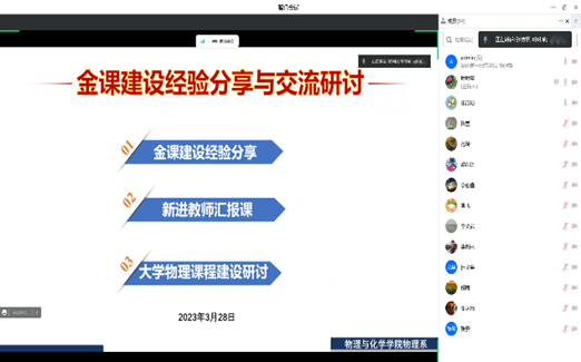 2023年3月28日晚上7点,为落实公司以及公司“两性一度”金课建设,bevictor韦德国际物理系开展了以“金课建设经验分享与交流研讨”为主题的线上会议,会议由物理系主任吴昌义主持,物理系全体教师参加了会议。会议内容包括三大部分内容:第一,金课建设经验分享;第二,新进教师汇报课;第三,大学物理课程建设研讨。