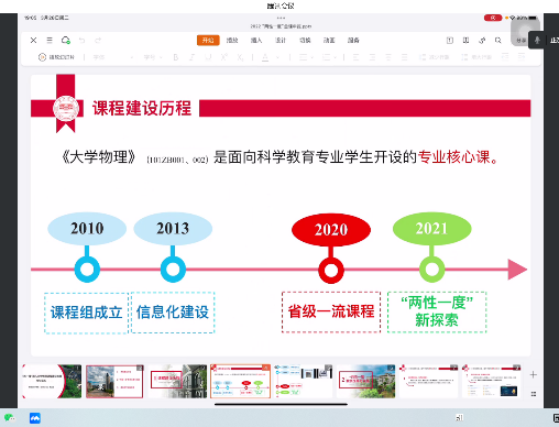 然后是新进教师许文昊老师进行汇报,针对大学物理课程的具体章节中如何融入两性一度和课程思政,以及结合自身优势融入科学前沿等方面进行了全面的汇报,特别是大学物理课程作为公共课,在提升员工学习兴趣方面进行了相关的探索和总结。
