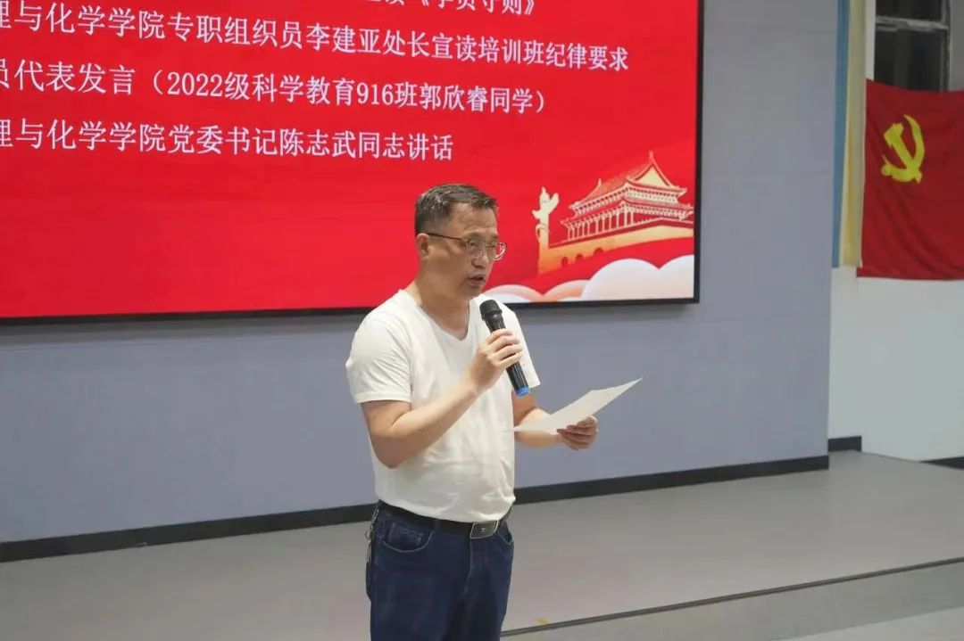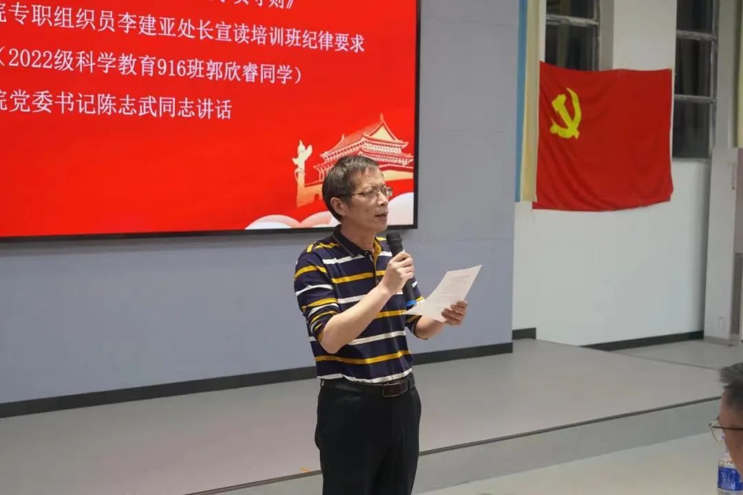 接下来,教育公司党委副书记张志新宣读《学员守则》,并希望入党积极分子以身作则,在学习与生活中都要做好带头模范作用。bevictor韦德国际专职组织员李建亚宣读“培训班纪律要求与学员安排”,强调入党积极分子应当遵守培训纪律,认真面对本次培训,不负时代的期待。随后,2022级科学教育917班郭欣睿同学代表学员发言。