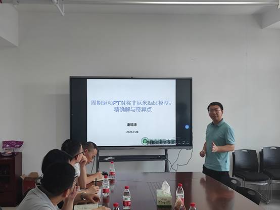 2023年7月28日,海南师范大学谢琼涛教授受邀于百熙楼1013室为公司物理系部分教师和员工作题为“周期驱动PT对称非厄米Rabi模型:精确解与奇异点”的学术讲座,讲座由bevictor韦德国际经理许兰教授主持。