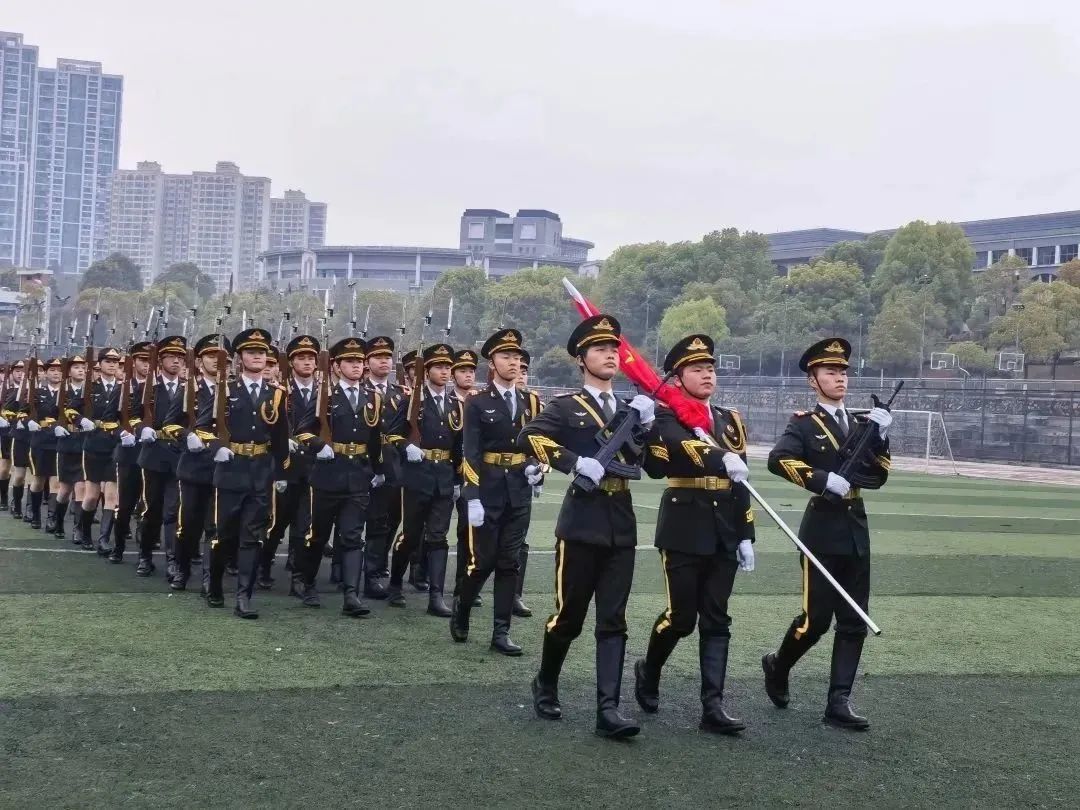 歌声嘹亮,步履铿锵。伴随着激扬的《运动员进行曲》,国旗护卫队身姿挺拔精神饱满,不惧风雨,踏着矫健的步伐,动作整齐划一,送着鲜红的五星红旗迎光而来。随着护旗手振臂一挥,五星红旗从旗杆最低处缓缓上升,在最高处绽放,随风飘扬。全体师生肃然起敬,唱着雄壮激昂的国歌,行注目礼,向国旗致以崇高的敬意。
